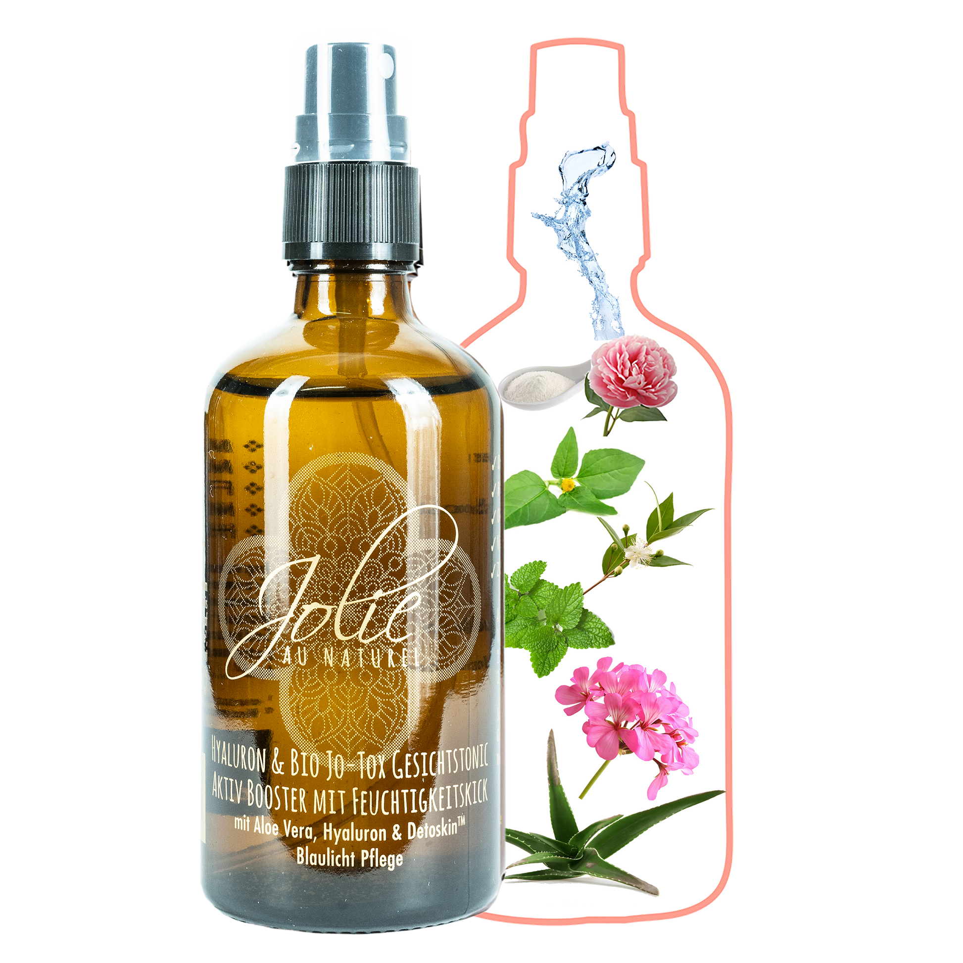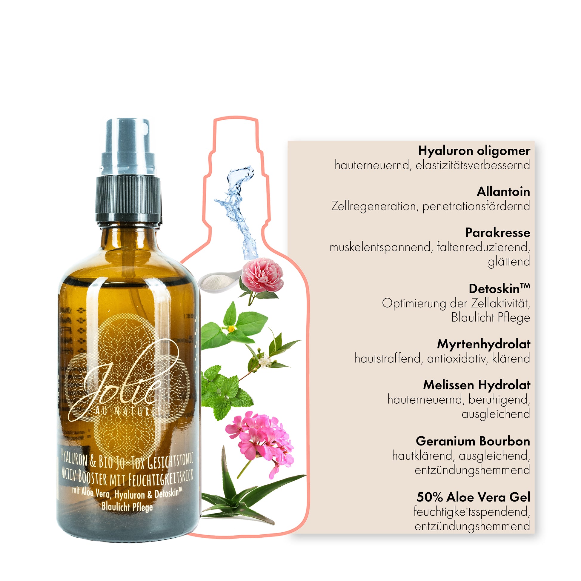 Das Hyaluron Jo-Tox Gesichtstonic spendet Frische und Feuchtigkeit mit 50% Aloe Vera, ausgleichendem Geranium Bourbon, hauterneuernder Melisse & hautstraffendem Myrtenhydrolat.