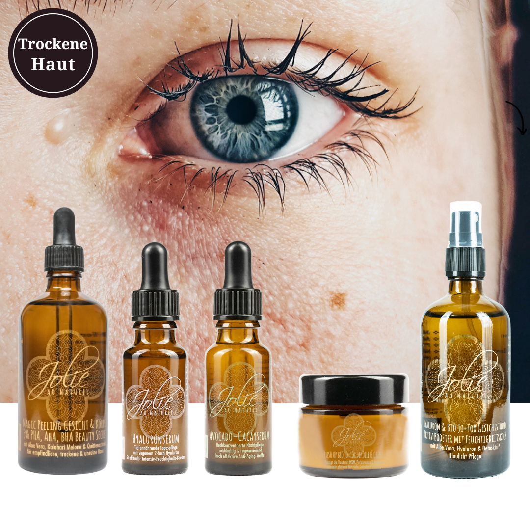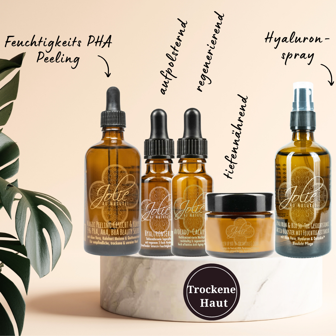 Entdecke das ultimative Verwöhnprogramm für Deine trockene Haut mit dem Hyaluron Trockene Haut Routine Set von Jolie au Naturel. Diese luxuriöse Pflegeroutine versorgt Deine Haut intensiv mit Feuchtigkeit, stärkt die Hautbarriere und schenkt Dir ein geschmeidig-weiches Hautgefühl. Erlebe eine Haut, die sichtbar glatter, strahlender und elastischer wirkt – Tag für Tag.