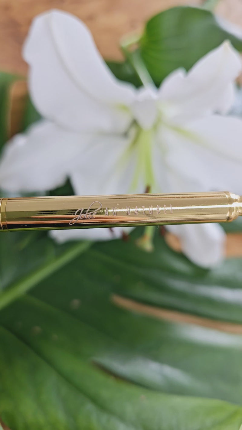 Inspiriert von den kostbaren Inhaltsstoffen unserer Jolie au Naturel Hyaluron Pflegeprodukte steht der Kugelschreiber für die perfekte Verbindung von Natürlichkeit und Glamour. Er erinnert an die hochwertigen, natürlichen Wirkstoffe, die in unserer Pflegekosmetik zum Einsatz kommen – elegant, wirkungsvoll und zeitlos schön.