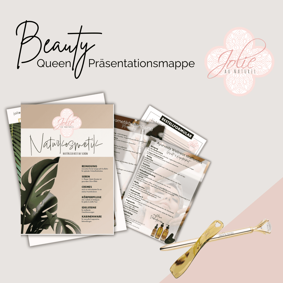 Die Beauty Queen Präsentationsmappe von Jolie au Naturel ist die perfekte Zusammenstellung für Kosmetikstudios, um das umfassende Behandlungskonzept und die exklusiven Produkte elegant zu präsentieren. Sie enthält: