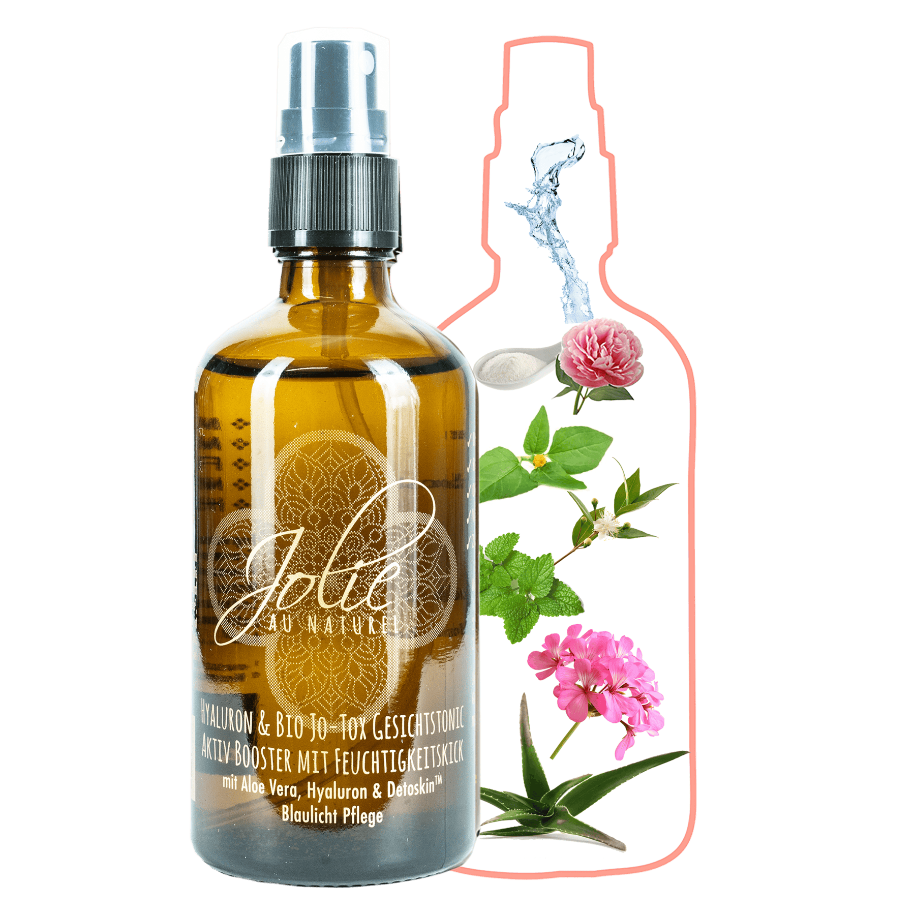 Das Hyaluron Jo-Tox Gesichtstonic spendet Frische und Feuchtigkeit mit 50% Aloe Vera, ausgleichendem Geranium Bourbon, hauterneuernder Melisse & hautstraffendem Myrtenhydrolat.