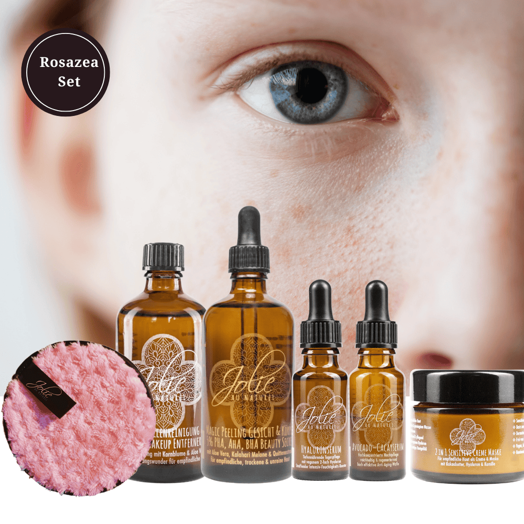 Leide nicht länger unter den typischen Symptomen von Rosazea wie Rötungen, Reizungen und Trockenheit. Unser Endkunden Rosazea Routine Set von Jolie au naturel bietet eine sanfte, aber effektive Pflegelösung, die speziell entwickelt wurde, um diese Beschwerden zu lindern. Mit sorgfältig ausgewählten Inhaltsstoffen in unserem Mizellenwasser, Hyaluronserum, Avocado-Cacay Serum und der 2in1 Creme Maske, unterstützt dieses Set die Stärkung der Hautbarriere, spendet intensiv Feuchtigkeit und reduziert Hautirritationen für ein beruhigtes, ausgeglichenes Hautbild.