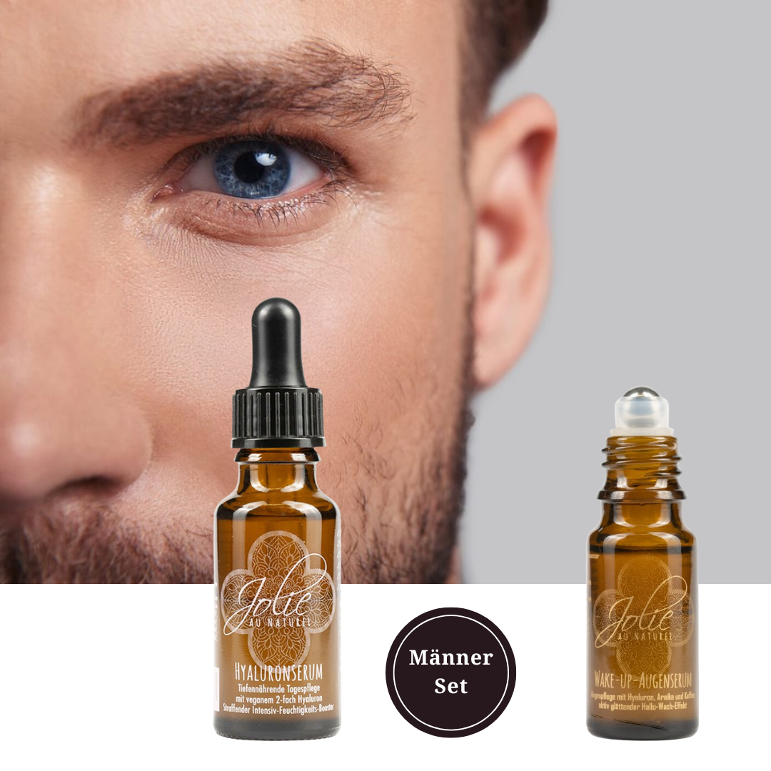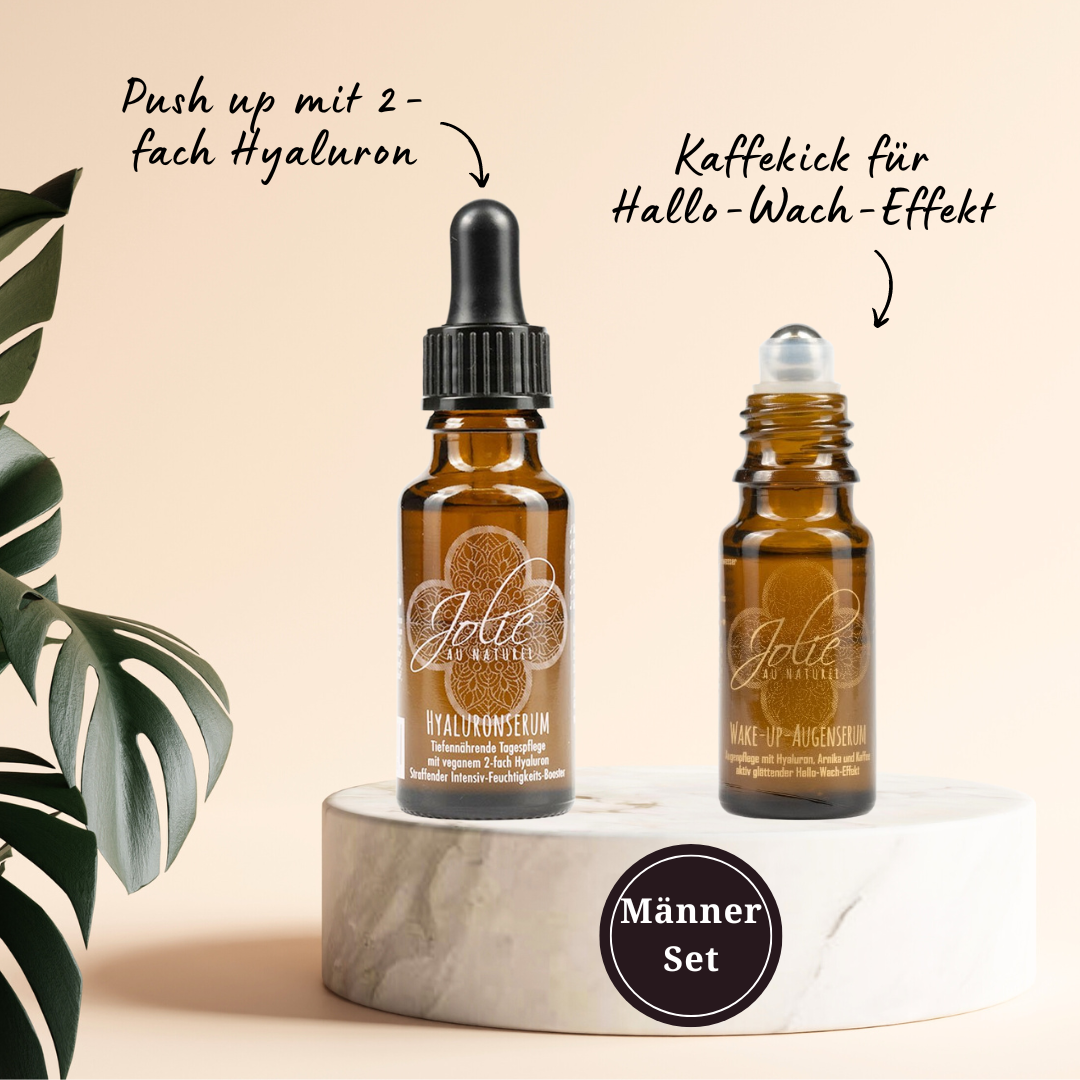 Steh Deine Mann und gönn Dir das Männer Set mit unserem Hyaluronserum & Wake-Up Augenserum, um Deiner Haut die optimale Pflege und jugendliche Ausstrahlung zu verleihen, die sie verdient – perfekt für den modernen Mann, der Wert auf sein Aussehen legt!