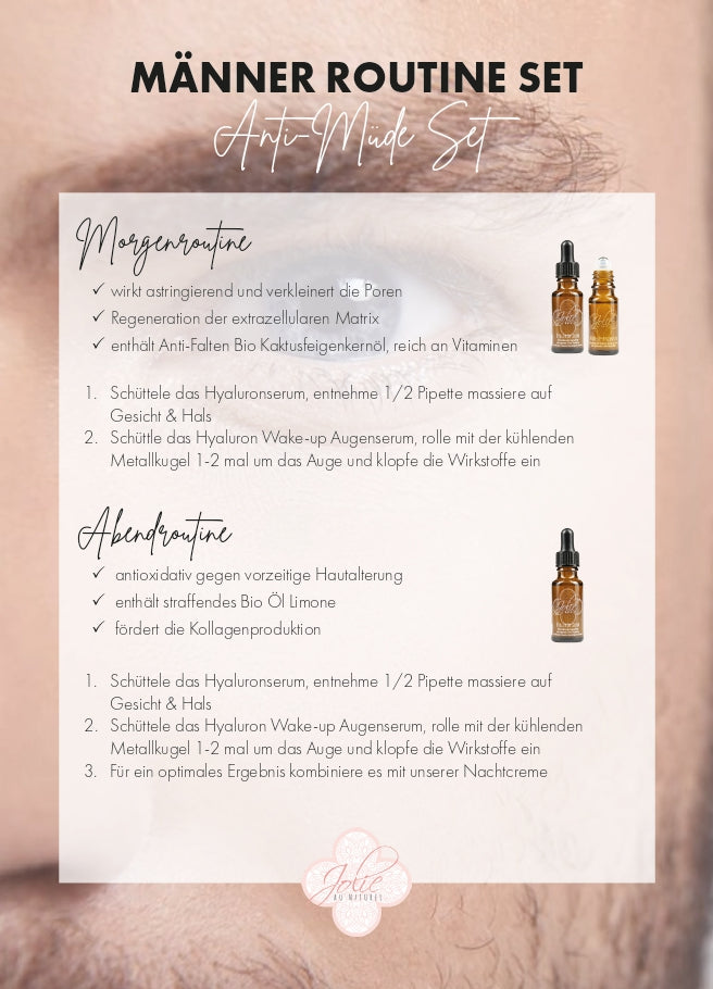 Männerhaut ist täglich Belastungen ausgesetzt – Rasur, Stress, Sport, Umwelteinflüsse. Gleichzeitig zeigen sich Trockenheit, erste Fältchen oder müde Augen oft früher als erwartet. Genau hier setzt das Männer Routine Set von Jolie au Naturel an.