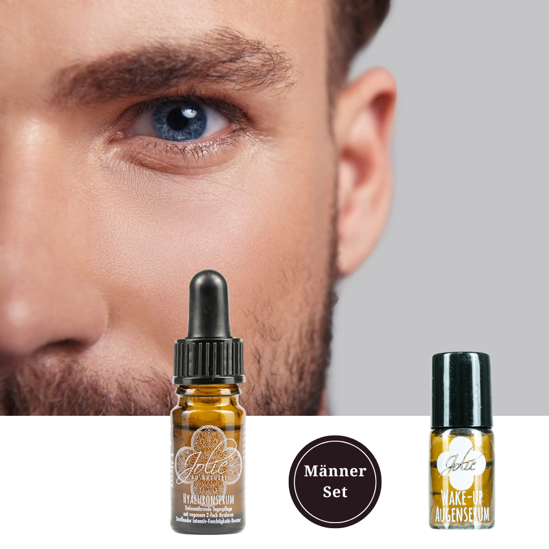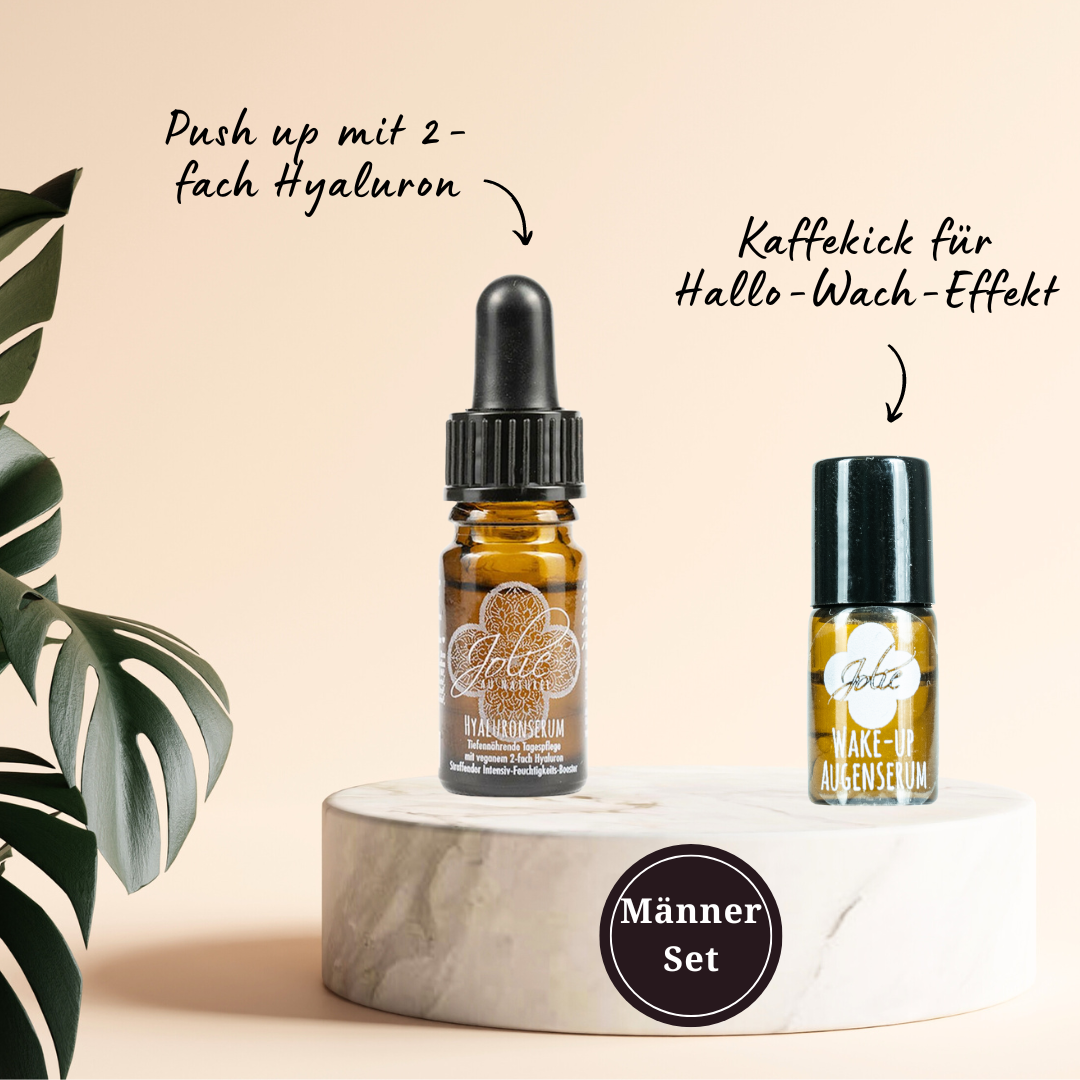 Steh Deinen Mann und gönn Dir das Männer Set mit unserem Hyaluronserum & Wake-Up Augenserum, um Deiner Haut die optimale Pflege und jugendliche Ausstrahlung zu verleihen, die sie verdient – perfekt für den modernen Mann, der Wert auf sein Aussehen legt!