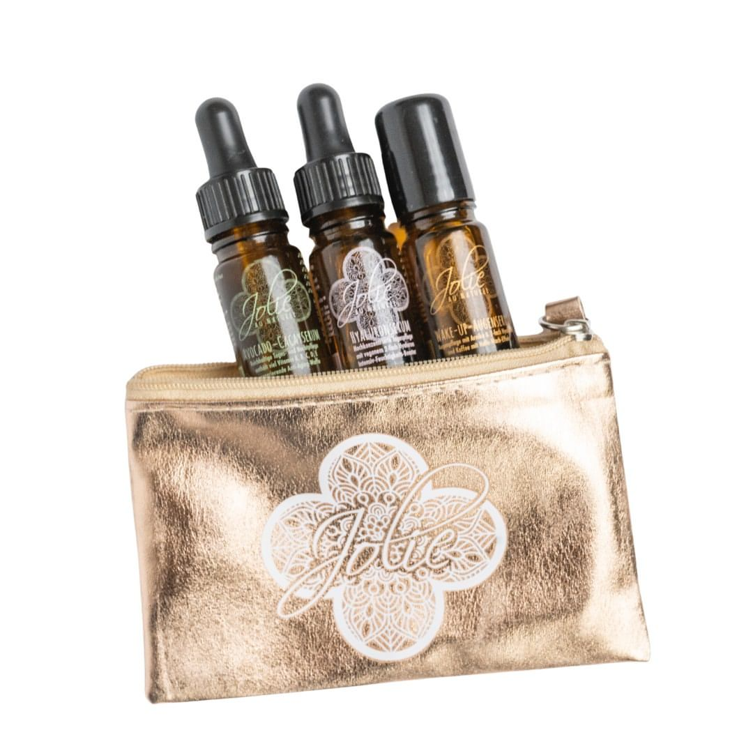 Geschüttelt, nicht gerührt – unser Wohlfühlset bestehend aus den Tages-, Nacht- und Augenserum ist ein echter Vitalstoff-Cocktail für Deine Haut . Für den perfekten Glow versorgt es Dich täglich mit dem richtigen Mix aus antioxidativ wirkendem Bio-Hamameliswasser, Bio-Rosenwasser, veganem Hyaluron und reinen Bio-Ölen.