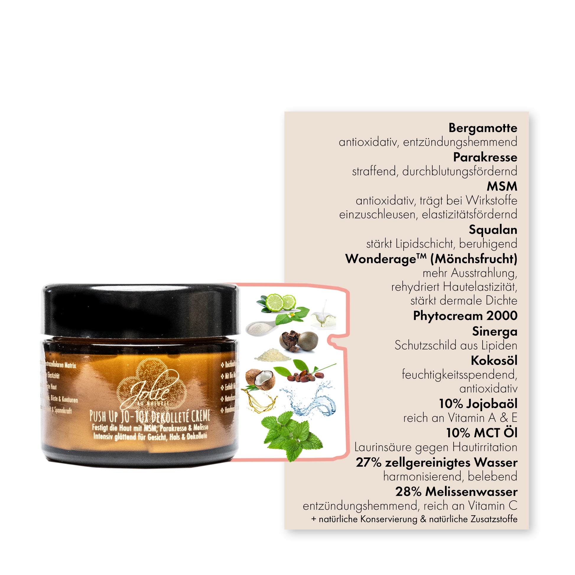 28% Melissenwasser für entzündungshemmende Kraft und Vitamin C, 27% zellgereinigtes Wasser für Harmonie und Belebung, sowie 10% MCT Öl mit Laurinsäure zur Abwehr von Hautirritationen. Die Kombination aus 10% Jojobaöl, Vitamin A & E und Kokosöl sorgt für intensive Feuchtigkeit und antioxidativen Schutz. Phytocream 2000 Sinerga ist das Lipid-Schutzschild, und Wonderage™ (Mönchsfrucht) sorgt für strahlende, elastische Haut. Squalan stärkt die natürliche Lipidschicht und beruhigt, MSM wirkt antioxidativ und fördert die Elastizität, während Parakresse die Haut strafft und die Durchblutung anregt. Abgerundet wird dies durch Bergamotte mit antioxidativer und entzündungshemmender Kraft für eine strahlende Haut.