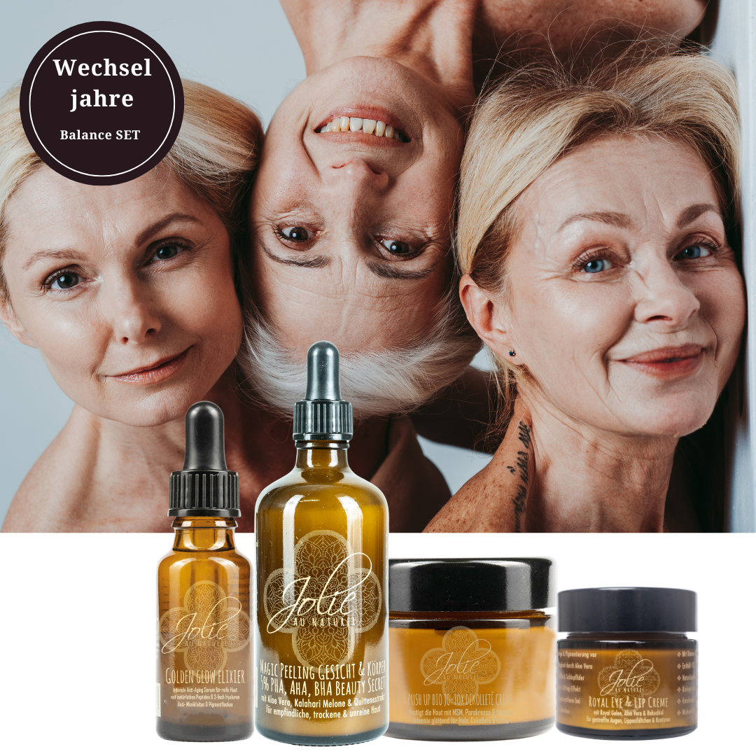 Unser ganzheitliches Wechseljahre-Set ist speziell darauf abgestimmt, reifer Haut wieder Strahlkraft, Festigkeit und Vitalität zu schenken – mit wertvollen Wirkstoffen aus der Natur, fein abgestimmt auf die Bedürfnisse in dieser besonderen Zeit.